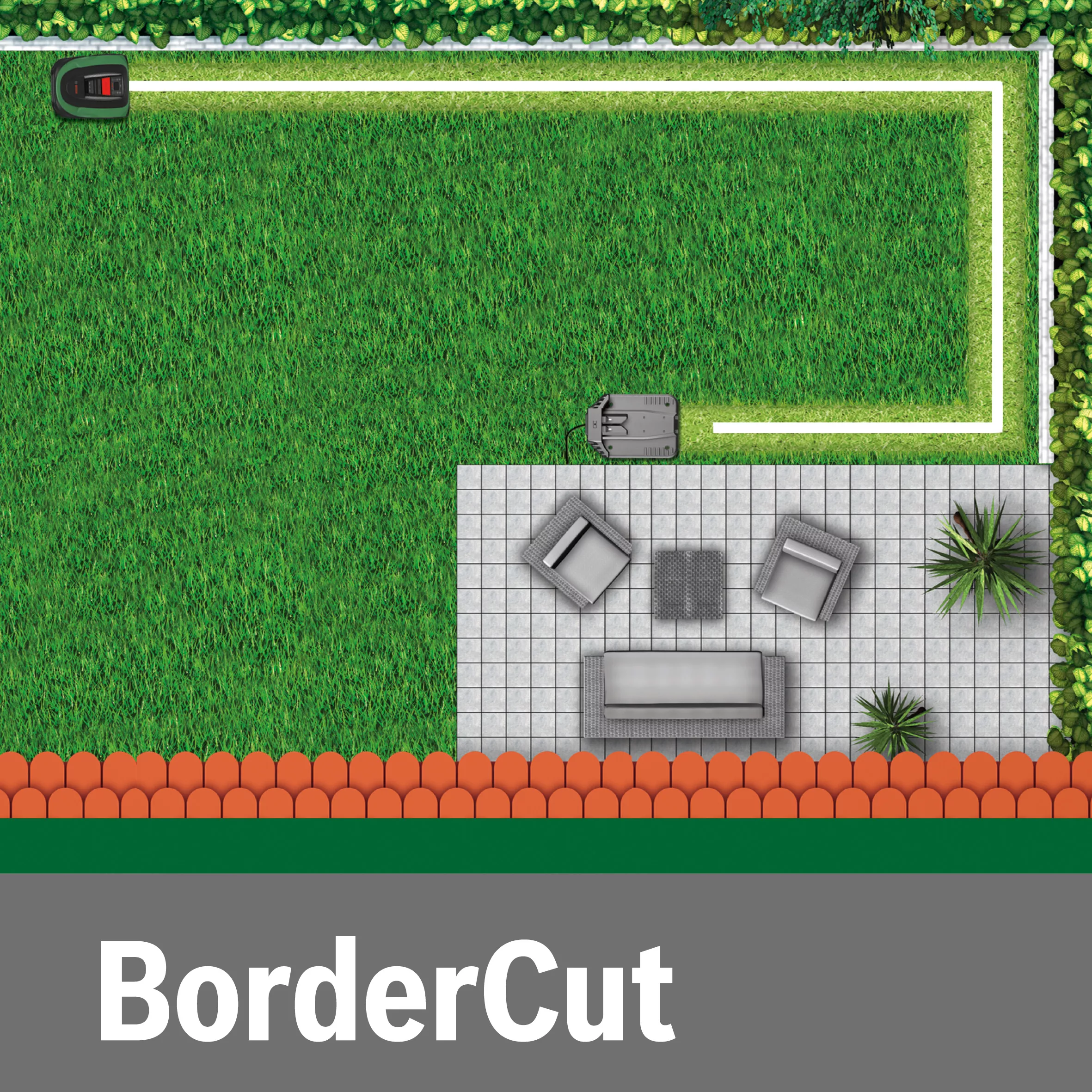 - LogiCut intelligent navigation maps the lawn and cuts in efficient parallel lines calculating the most efficient mowing route saving time and energy.